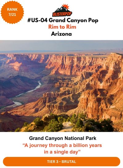 Grand Canyon Rim‑to‑Rim is a full crossing of one of the most iconic landscapes on Earth — a descent through a billion years of geologic time, a traverse of desert worlds, and a climb back into the sky. Starting on the cool, forested North Rim and finishing on the South Rim, this single‑day epic delivers heat, scale, river roar, and a sense of journey unlike anything else in the Blisterpop canon. It’s a mythic passage through deep time and canyon country — a true desert endurance classic.