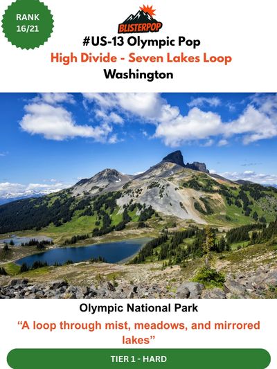 The High Divide – Seven Lakes Basin Loop is Olympic National Park at its most cinematic — a full‑day journey from moss‑draped rainforest to wildflower meadows, alpine lakes, and a high ridge with sweeping views of Mount Olympus and the Blue Glacier. Starting from the Sol Duc Valley, the trail climbs steadily to Deer Lake and Heart Lake before rising onto the High Divide, where Seven Lakes Basin spreads out below like a glacial amphitheater. The descent winds through meadows and forest, returning to the river in a peaceful, shaded finish. It’s a balanced, beautiful Pacific Northwest epic — mist, meadows, and mirrored lakes in one unforgettable loop.