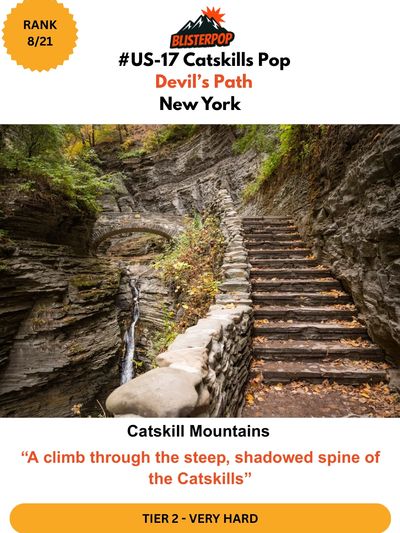 Devils Path is renowned as one of the most demanding day hikes in New York and the East — a 24-mile rollercoaster of steep ascents, scrambles, ledges, and forested summits across the rugged heart of the Catskills. Starting at Prediger Road, this Catskills hiking route climbs immediately into technical terrain, connecting Indian Head, Twin, Sugarloaf, Plateau, and West Kill in a relentless rhythm of up-and-down brutality. The forest is dense, mossy, and ancient, with brief cliffside views breaking through the canopy. It’s gritty, dramatic, and deeply atmospheric — a challenging climb through the steep, shadowed spine of the Catskills.